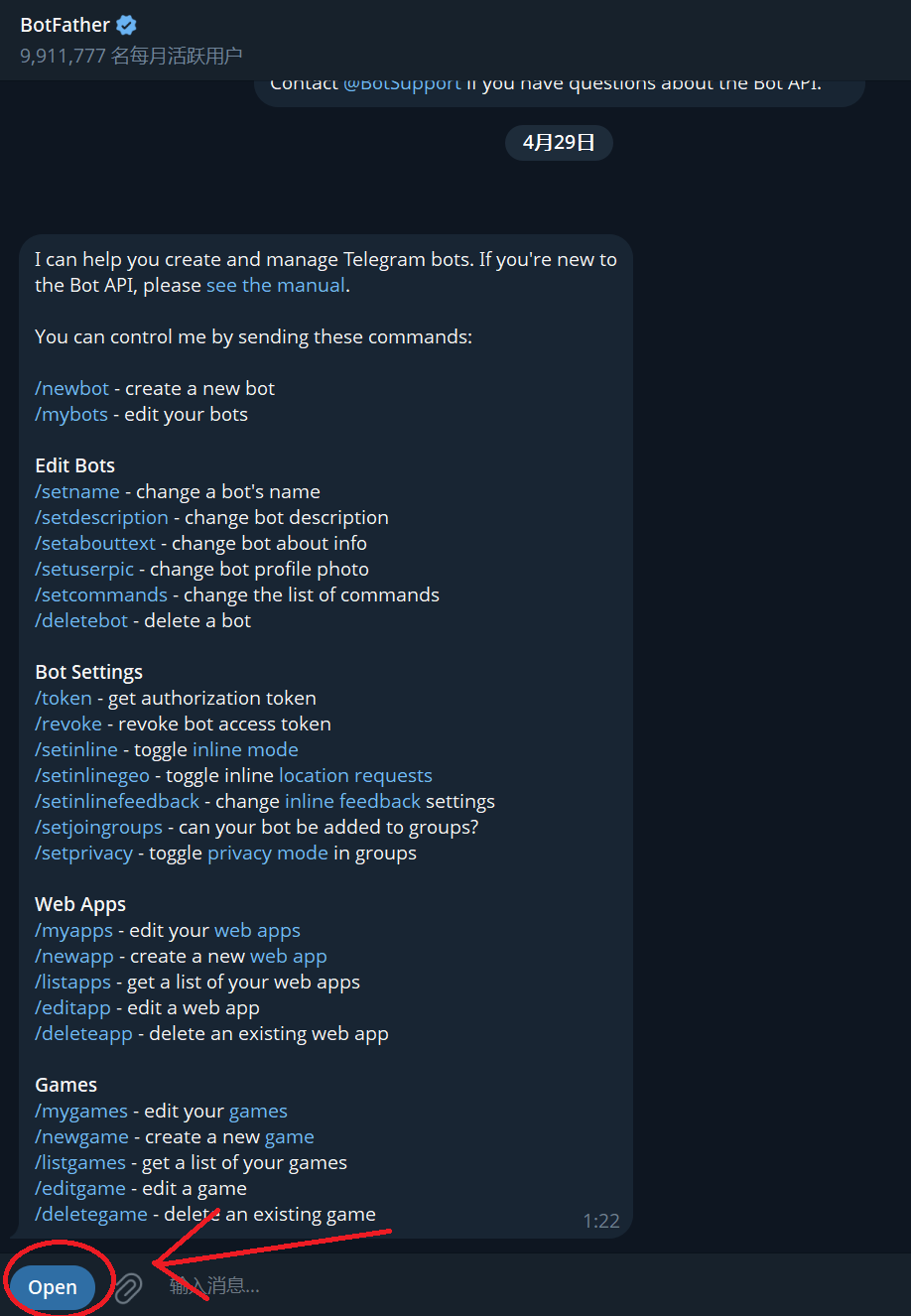 在 Telegram 的 @BotFather (opens in a new tab) 聊天窗口的左下角点击 打开 (